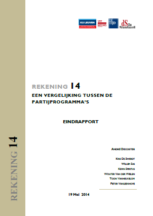 Spiritus, K.F.J., Vanheukelom, T., Decoster, A, De Swerdt, K., Sas, W., van der Wielen, W., & Vanleenhove, P. (2014). Rekening 14 - Een Vergelijking Tussen de Partijprogramma's. Eindrapport. KU Leuven. Retrieved from http://hdl.handle.net/1765/122041 |