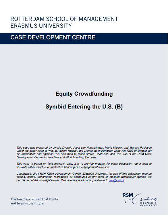 Dvorak, J., van Houwelingen, J., Klipper, M., Paulsson, M., & Hulsink, W. (2014). Equity Crowdfunding: Symbid Entering the U.S. (B). RSM Case Development Centre. Retrieved from http://hdl.handle.net/1765/137151