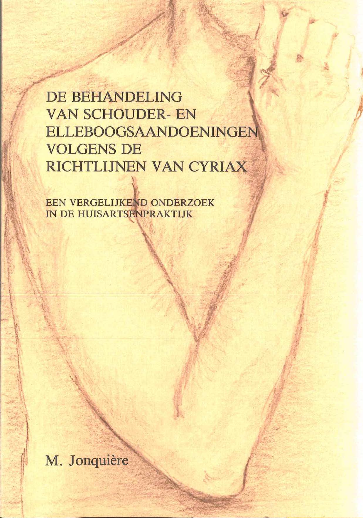 Jonquière, M. (1986, June 11). De behandeling van schouder- en elleboogsaandoeningen volgens de richtlijnen van Cyriax: een vergelijkend onderzoek in de huisartsenpraktijk. Retrieved from http://hdl.handle.net/1765/37443 |