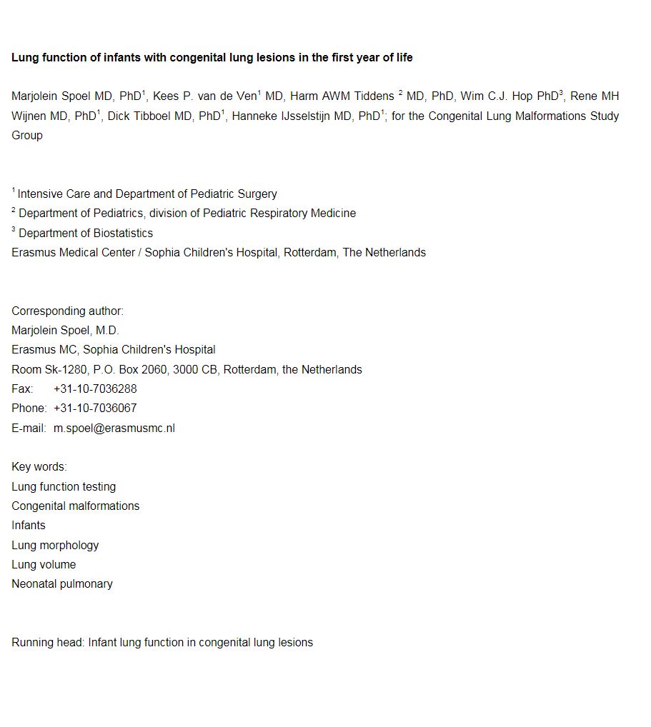 Spoel, M., van de Ven, K., Tiddens, H., Hop, W., Wijnen, R., Tibboel, D., & IJsselstijn, H. (2012). Lung Function of Infants with Congenital Lung Lesions in the First Year of Life. Neonatology: fetal and neonatal research, 103(1), 60–66. doi:10.1159/000342224 |
