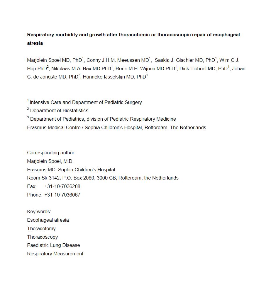 Spoel, M., Meeussen, C., Gischler, S., Hop, W., Bax, K., Wijnen, R., … IJsselstijn, H. (2012). Respiratory morbidity and growth after open thoracotomy or thoracoscopic repair of esophageal atresia. Journal of Pediatric Surgery, 47(11), 1975–1983. doi:10.1016/j.jpedsurg.2012.07.044 |