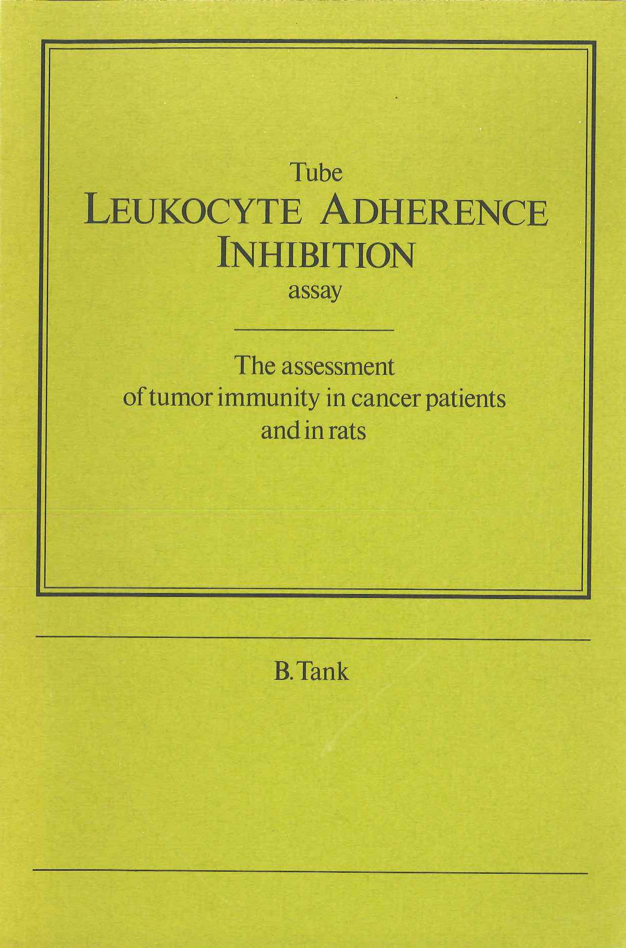 Tank, B. (1985, June 19). Tube leukocyte adherence inhibition assay : the assessment of tumor immunity in cancer patients and in rats. Retrieved from http://hdl.handle.net/1765/38633 |