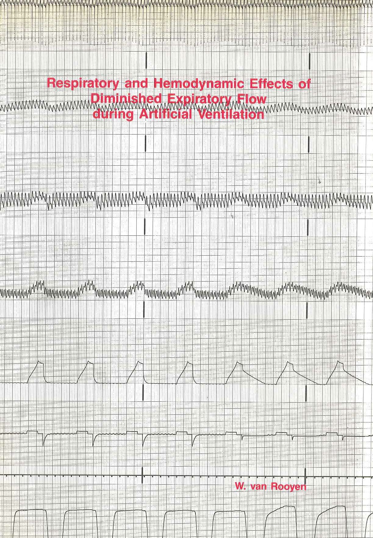 The supposition, that a diminished expiratory flow (DEF) during artificial ventilation will improve blood-gas exchange. especially in obstructive pulmonary disease and that DEF improves blood-gas exchange better than a comparable positive end-expiratory pressure (PEEP. producing the same rise in mean tracheal pressure) was explored in experiments using Yorkshire piglets, without altering respiratory rate, tidal volume, inspiratory time~ inspiratory hold or expiratory time. During mechanical ventilation the effects of DEF and a comparable PEEP on hemodynamics, gas exchange and pulmonary mechanics were studied. These effects were compared to each other and to intermittent positive pressure ventilation (IPPV) in health and disease induced by histamine. acetylcholine or oleic acid in order to evaluate hypothetic mechanisms of the effects of DEF. Additionally the validity of cardiac output estimation by the thermodilution method and the cyclic modulation of these estimates during the three modes of mechanical ventilation were analysed in order to find the most appropriate way of calculating mean cardiac output from the smallest number of estimates. In chapter II the experimental model and the methods are described. In chapter III cardiac output estimations by the thermodilution method are evaluated. The results of hemodynamic and respiratory effects (pulmonary mechanics and gas exchange) of DEF and PEEP are presented in chapter IV and discussed in chapter v. In chapter VI the effects of the expiratory flow on the exchange of carbon dioxide during mechanical ventilation are studied using single breath analyses