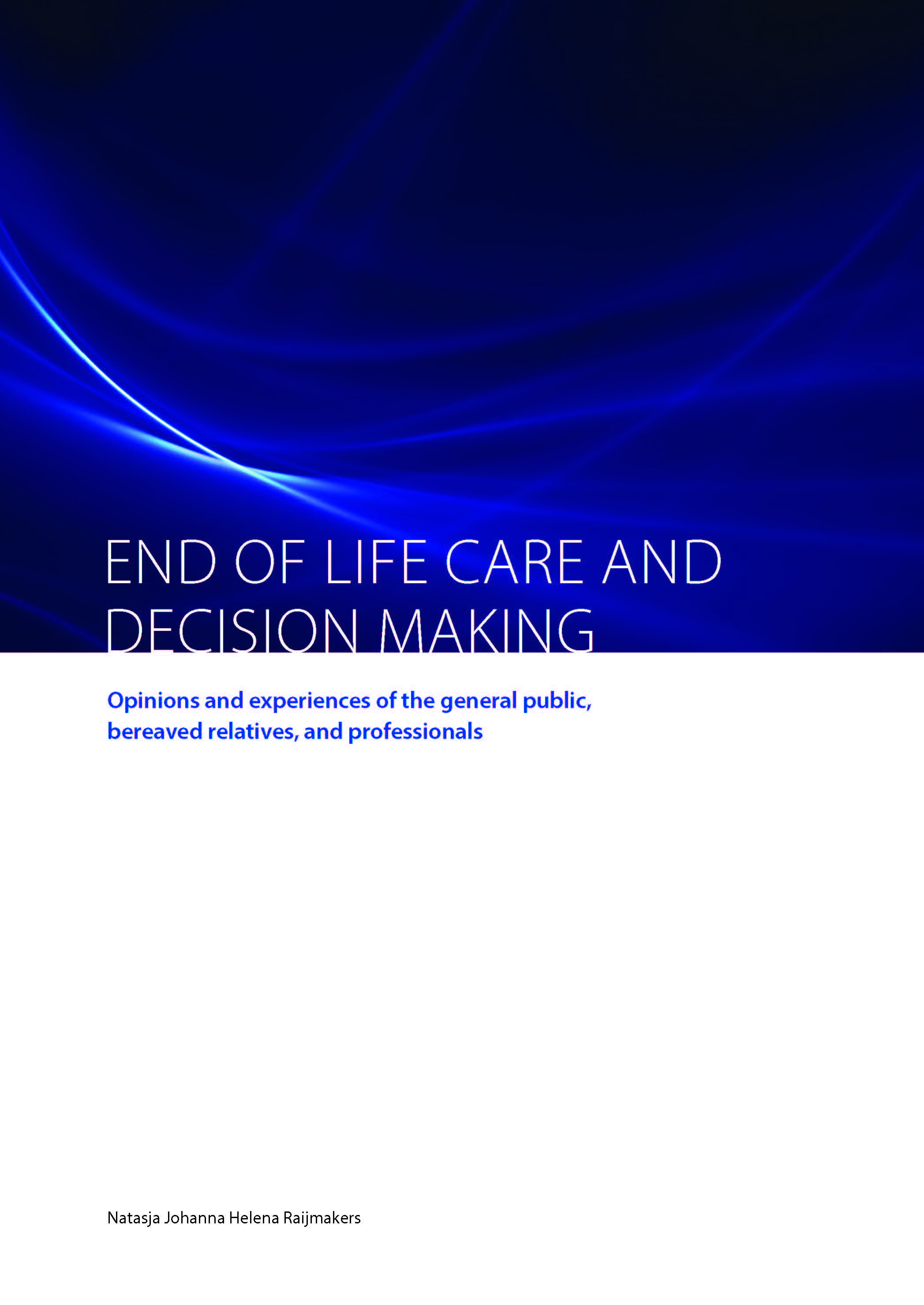 End-of-life care aims to improve quality of life of patients and their relatives facing problems associated with life-threatening illness in the last days of life. End-of-life decision-making is an important aspect of end-of-life care that can have a significant impact on the process of dying and dying patients’ comfort in the last days of life. Moreover, end-of-life decisions are known to occur in 23-51% of all deaths in Europe and are subject to societal debate. Better understanding of current public opinion on end-of-life decisions can strengthen the societal debate in the Netherlands. End-of-life decision-making regarding artificial nutrition and hydration at the end of life is internationally shared to be important and better understanding can contribute to better end-of-life care. The aim of this thesis was to contribute to better understanding of end-of-life decision-making practices. One of the findings is that there is ample support for the Dutch Euthanasia Act, both among the general public and healthcare professionals, especially in the presence of physical symptoms. Both the general public and professionals consider euthanasia more problematic if a patient’s unbearable suffering is rooted in psychosocial problems or spiritual issues. Furthermore, at this moment providing artificial nutrition and hydration at the end of life is a frequent practice, although the effects on comfort seem limited. End-of-life decision-making regarding artificial nutrition and hydration can substantially improve by more evidence-based guidance, in which special attention is needed for communication about the impact of nutrition and hydration at the end of life.