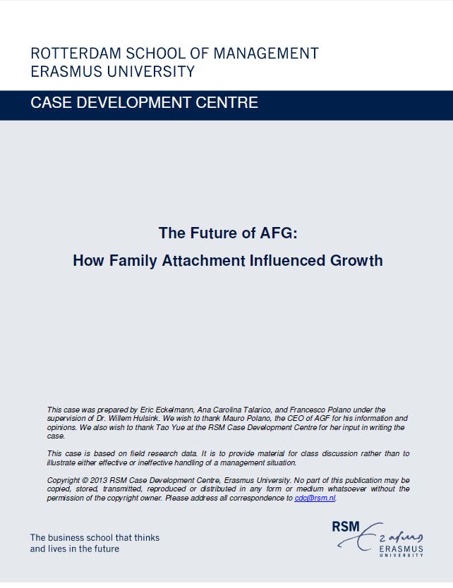 Hulsink, W., Polano, F., Eckelmann, E., & Talarico, A. C. (2013). The Future of AFG: How Family Attachment Influenced Growth. RSM Case Development Centre. Retrieved from http://hdl.handle.net/1765/40384 |