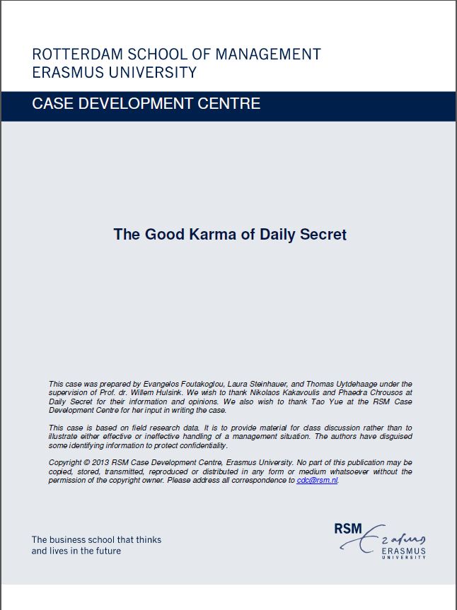 Hulsink, W., Foutakoglou, E., Steinhauer, L., & Uytdehaage, T. (2013). The Good Karma of Daily Secret. RSM Case Development Centre. Retrieved from http://hdl.handle.net/1765/40386 |