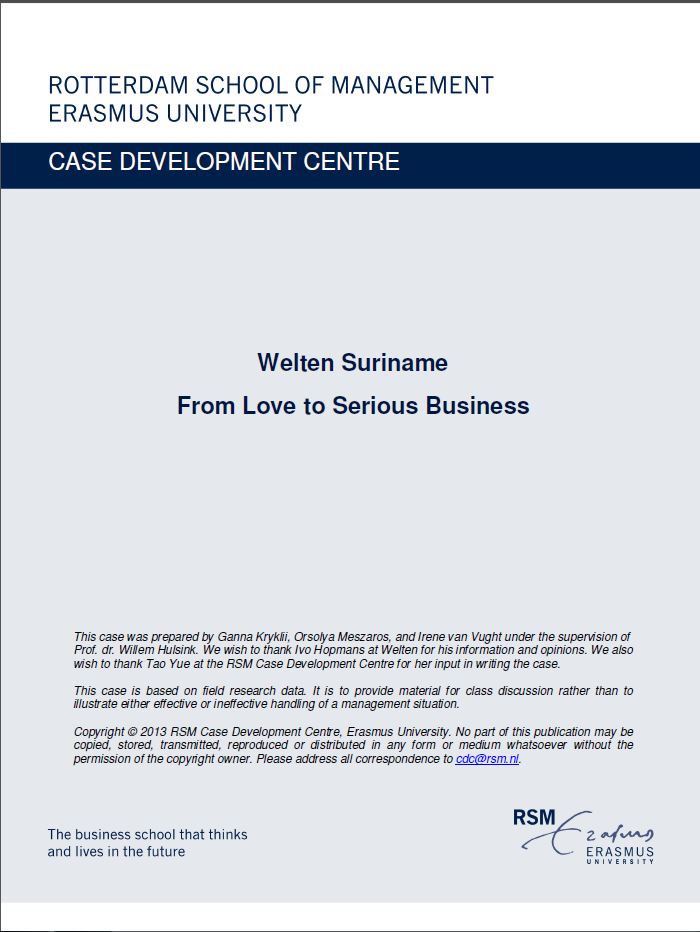 Hulsink, W., Kryklii, G., Meszaros, O., & van Vught, I. (2013). Welten Suriname: From Love to Serious Business. RSM Case Development Centre. Retrieved from http://hdl.handle.net/1765/40391 |