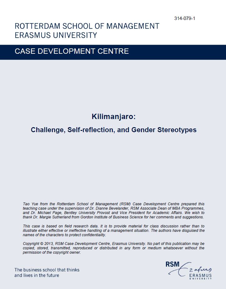 Yue, T., Bevelander, D., & Page, M. (2014). Kilimanjaro: Challenge, Self-reflection and Gender Stereotypes. RSM Case Development Centre. Retrieved from http://hdl.handle.net/1765/51437 |