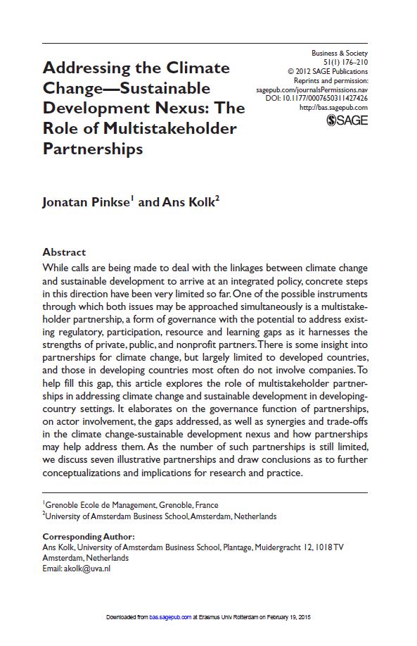 Pinkse, J., & Kolk, A. (2012). Addressing the climate change-sustainable development nexus: The role of multistakeholder partnerships. Business & Society: a journal of interdisciplinary exploration, 51(1), 176–210. doi:10.1177/0007650311427426 |
