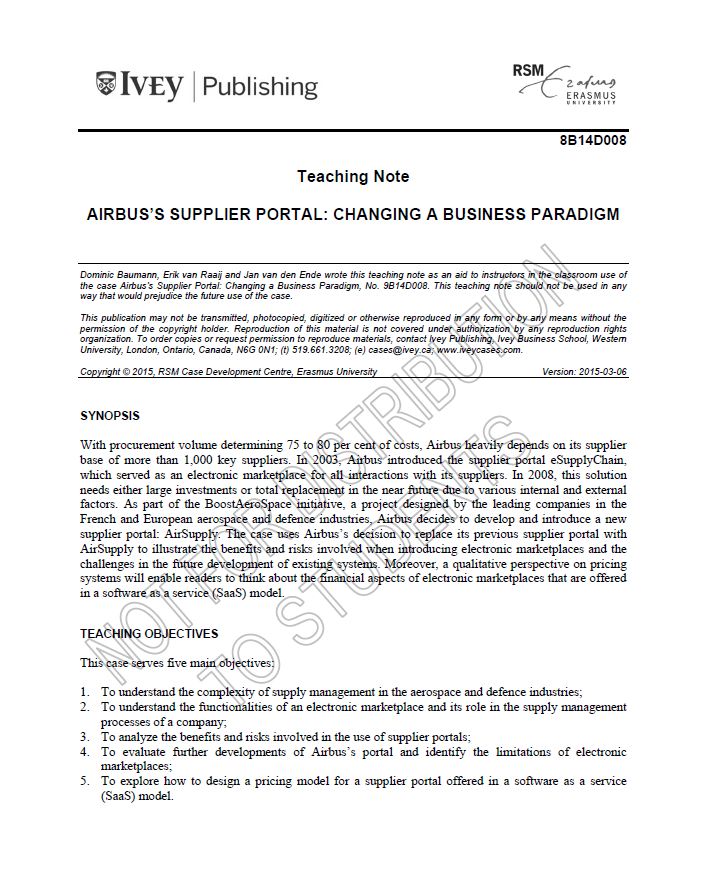 van Raaij, E., van den Ende, J., & Baumann, D. (2015). Airbus’s Supplier Portal: Changing a Business Paradigm. RSM Case Development Centre. Retrieved from http://hdl.handle.net/1765/77961 |