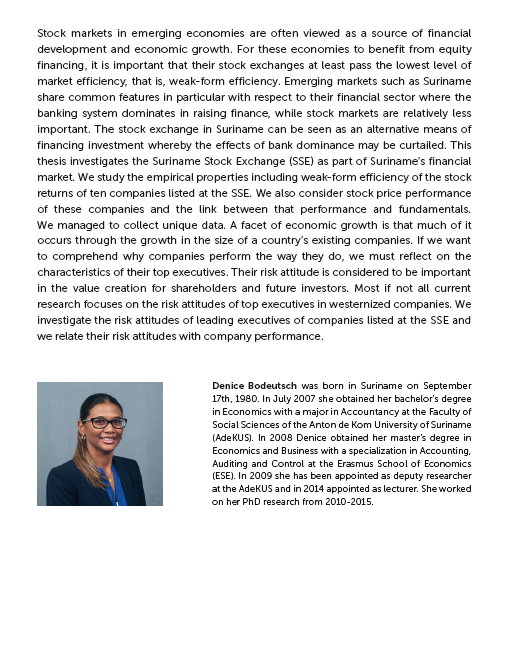 Emerging economies share common features in particular with respect to their financial sector where the banking system dominates in raising finance, while stock markets are relatively less important (indirect versus direct finance). However, by providing alternative means of financing investment, stock markets may curtail the effects of bank dominance. In Suriname the banking system has traditionally also been the major player in the financial sector. With this the stock exchange in Suriname can be seen as an alternative financial source. Given the role that the stock exchange in Suriname can perform, this thesis investigates the Suriname Stock Exchange (SSE) as part of Suriname’s financial market. We study the empirical properties including weak-form efficiency of the stock returns of ten companies listed at the SSE. We also considered stock price performance of these companies and the link between that performance and fundamentals. We managed to collect unique data through various possibilities of data collection.