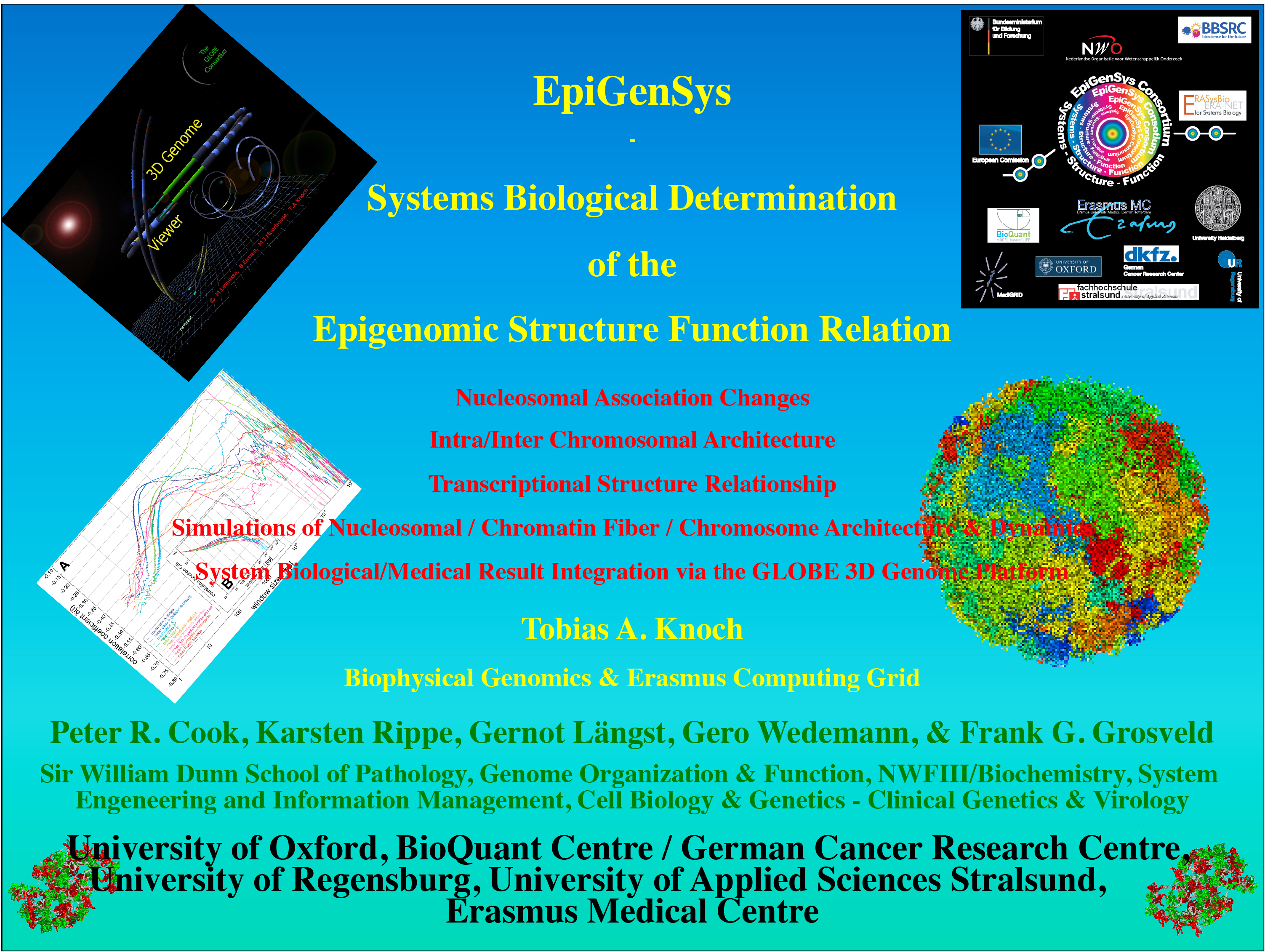 EpiGenSys: – Systems biological determination of the epigenomic structure function relation: nucleosomal association changes, intra/inter chromosomal architecture, transcriptional structure relationship, simululations of nucleosomal/chromatin fiber/chromosome architecture and dynamics, and systems biological/medical result integration via the GLOBE 3D genome platform.